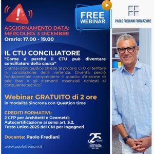 Webinar gratuito 11 luglio 2025 “Il CTU: dalle competenze alle attitudini. Ne vogliamo parlare?”11 Giugno 2025 Prosegui